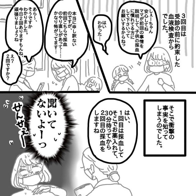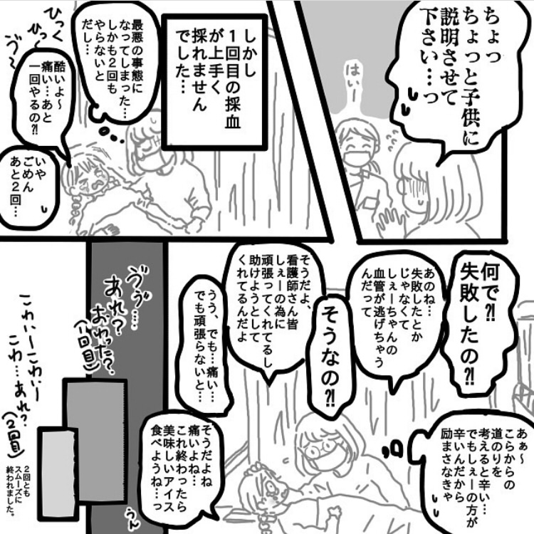 娘には看護師さんが悪いと思って欲しくなくてあれこれ話してはいたのですが、1人目の方がダメだったあと2人目の方がスッと採血完了したものだから…っ😭