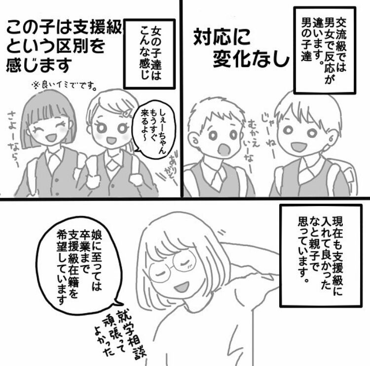 交流級(普通級)の男の子は支援級かどうか気にしている子を見た事がなく、良くも悪くも同じ対応してくれてると感じてます☺️✨