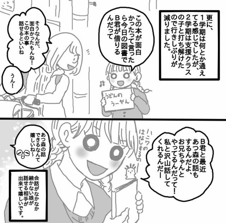 1学期は発達障害のコミュニケーションの本を買ったりして「好きな物があってもそれを他人と会話で共有出来ない。話したら一方的に話すだけになる」という文字を読んで親の私が凹んだりもしましたが😭💦