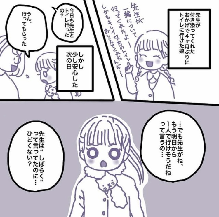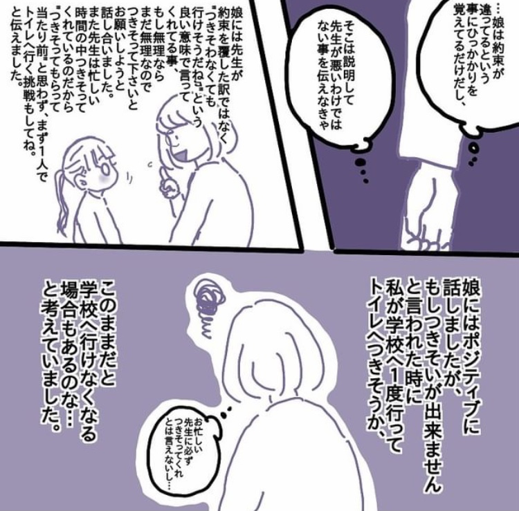 と伝え、まずは先生は忙しくてトイレへつきそってくれてる事を感謝こそすれ怒るのは違うよと話しました。