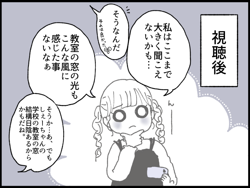結果ここまで聞こえづらくないとの事で(こんな風に聞こえる人もいるんだよって言ったらそれは大変だね!と言ってました)