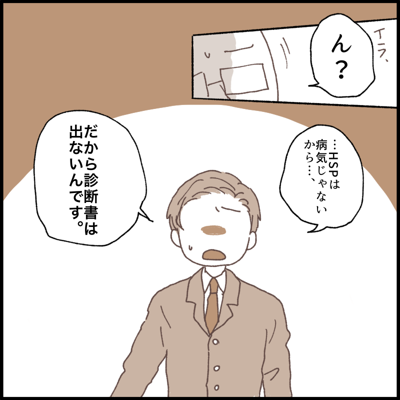 病気ではないのでhSPでの診断書自体は出ないけど、医師から直接口頭で伝えられる事はあります。伝えられると、それに適した診断書は貰えるので、受診をするか、受診をしないかでは大きく事態は変わってくると思うんです。