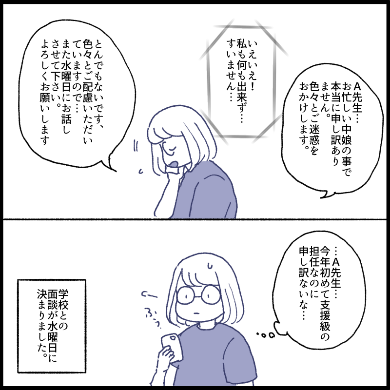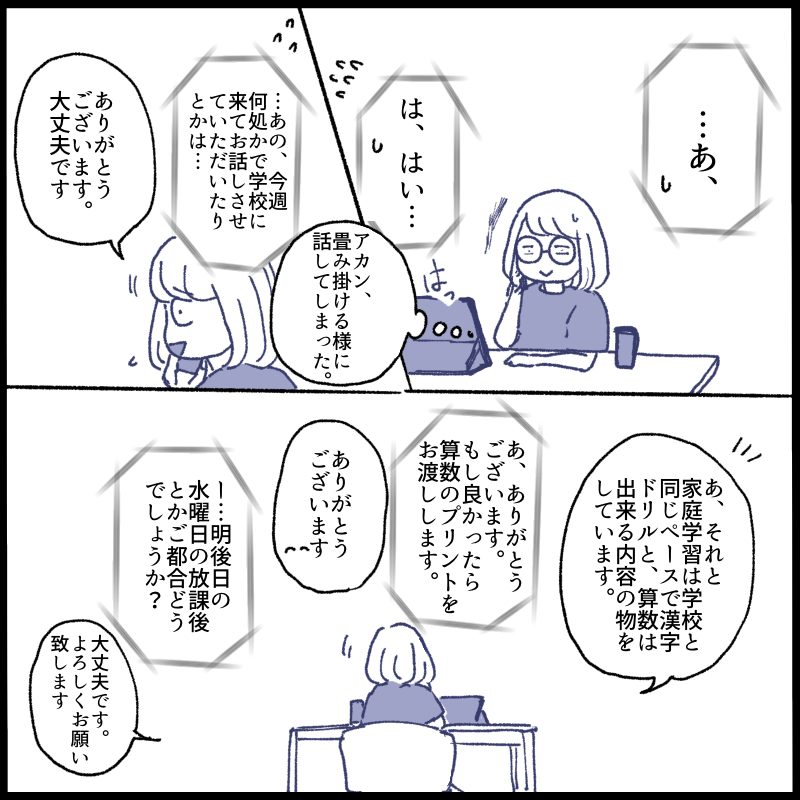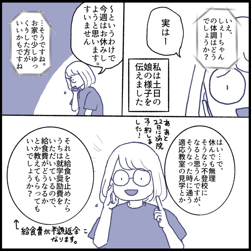 この時は不登校になると思っていたので、A先生に適応指導教室や(行くと出席になるところ。学校と繋がってる)給食の止め方など伺いました。