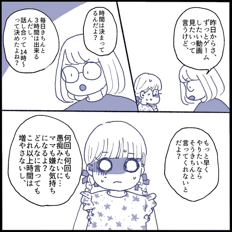 親としてはきちんと相談して話し合って時間も決めたのに(3時間と決めたのは私ですが何時にするかなどを話し合いました)何度も愚痴というか不満を聞いてると段々イライラとしてしまいました。