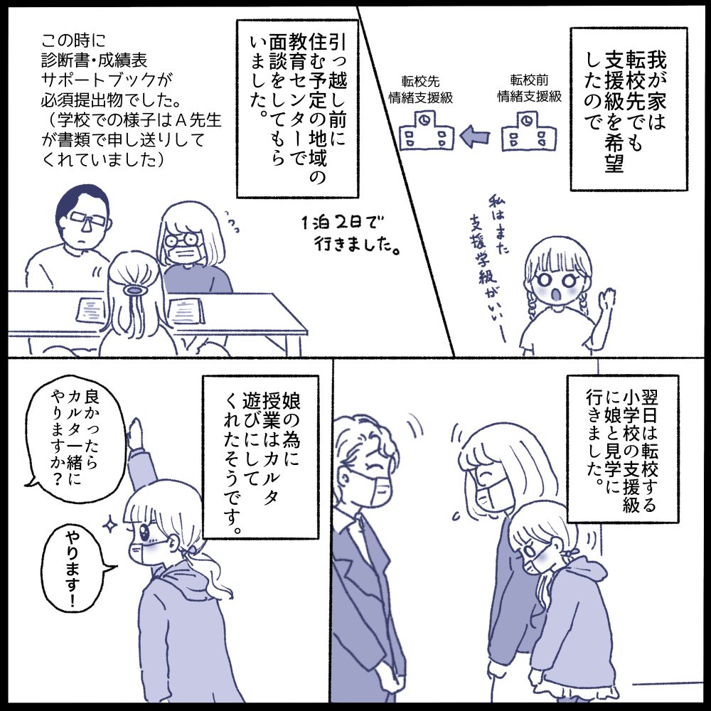 住む場所が決まったら、転校先の教育センターに電話しました。 支援級転籍の子は転校前に必ず面談をしなくてはいけないとのことで、引っ越し先に行くなら小学校見学もさせてもらう事にしました☺️(見学は事前に行って本当に良かったです。娘は元々場所見知りや人見知りはしないのであまり心配はなかったのですが、クラスメイトの子と次会う約束を何度もしてハイタッチも沢山して帰りました😂✨)
