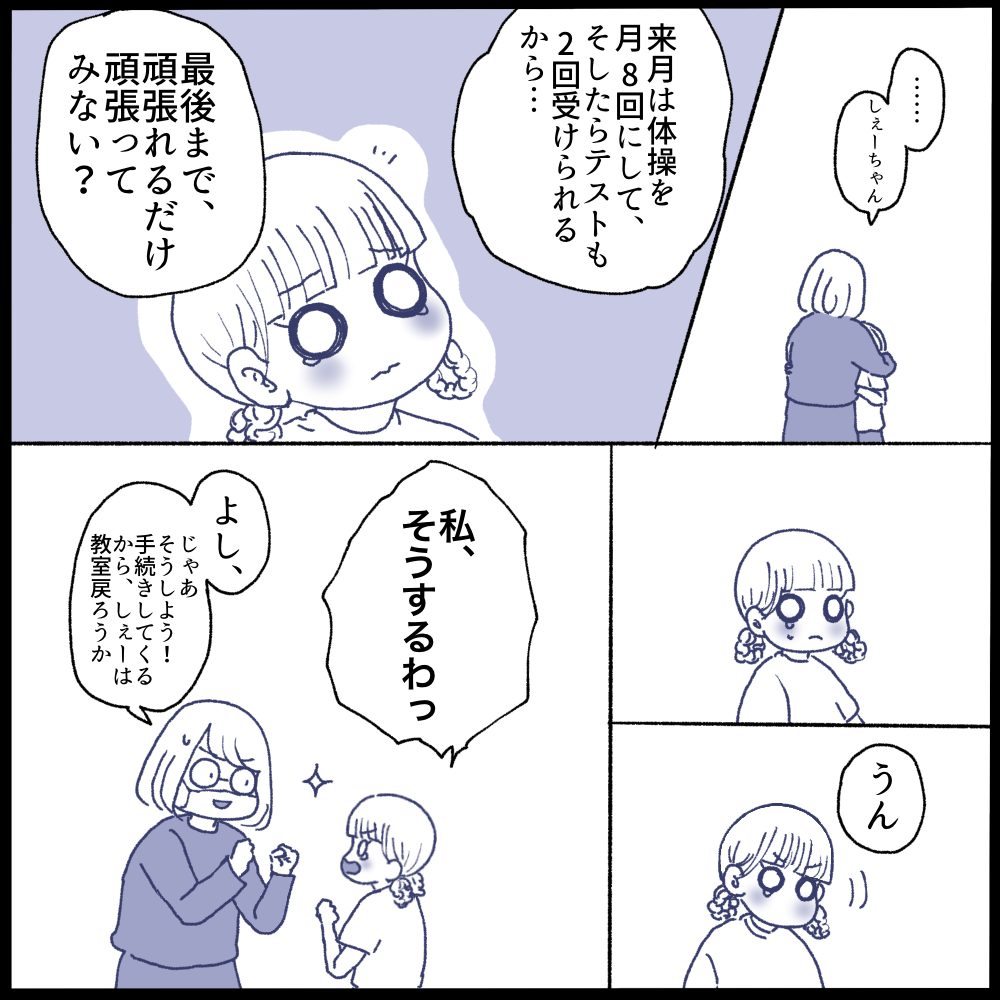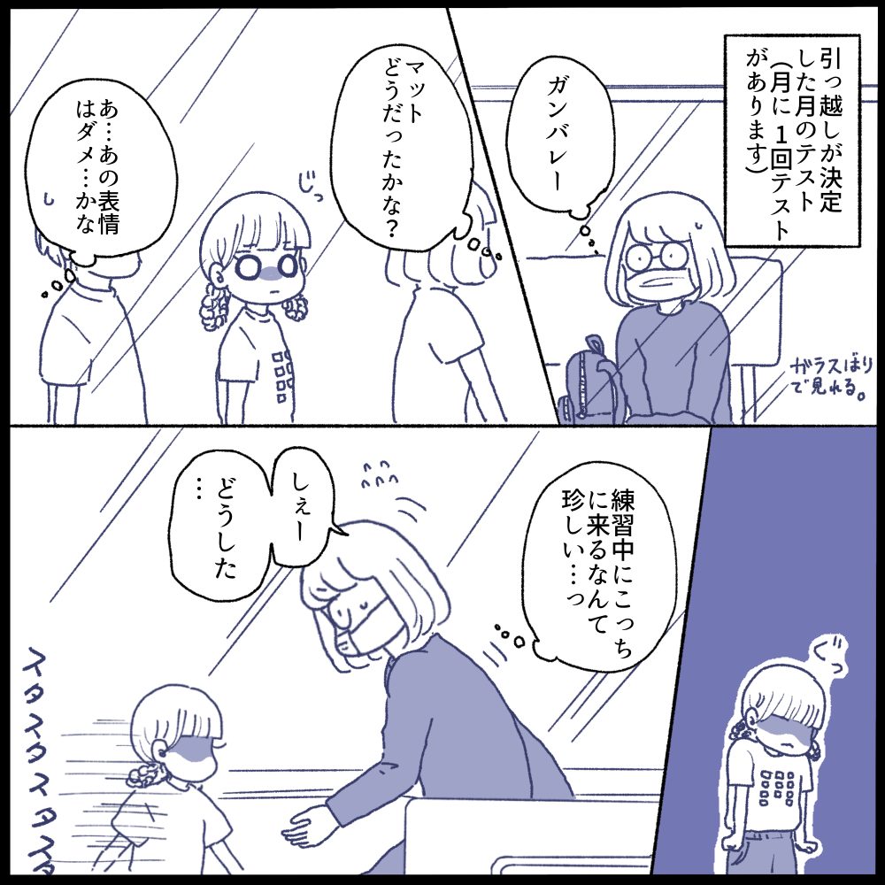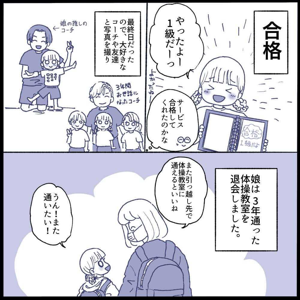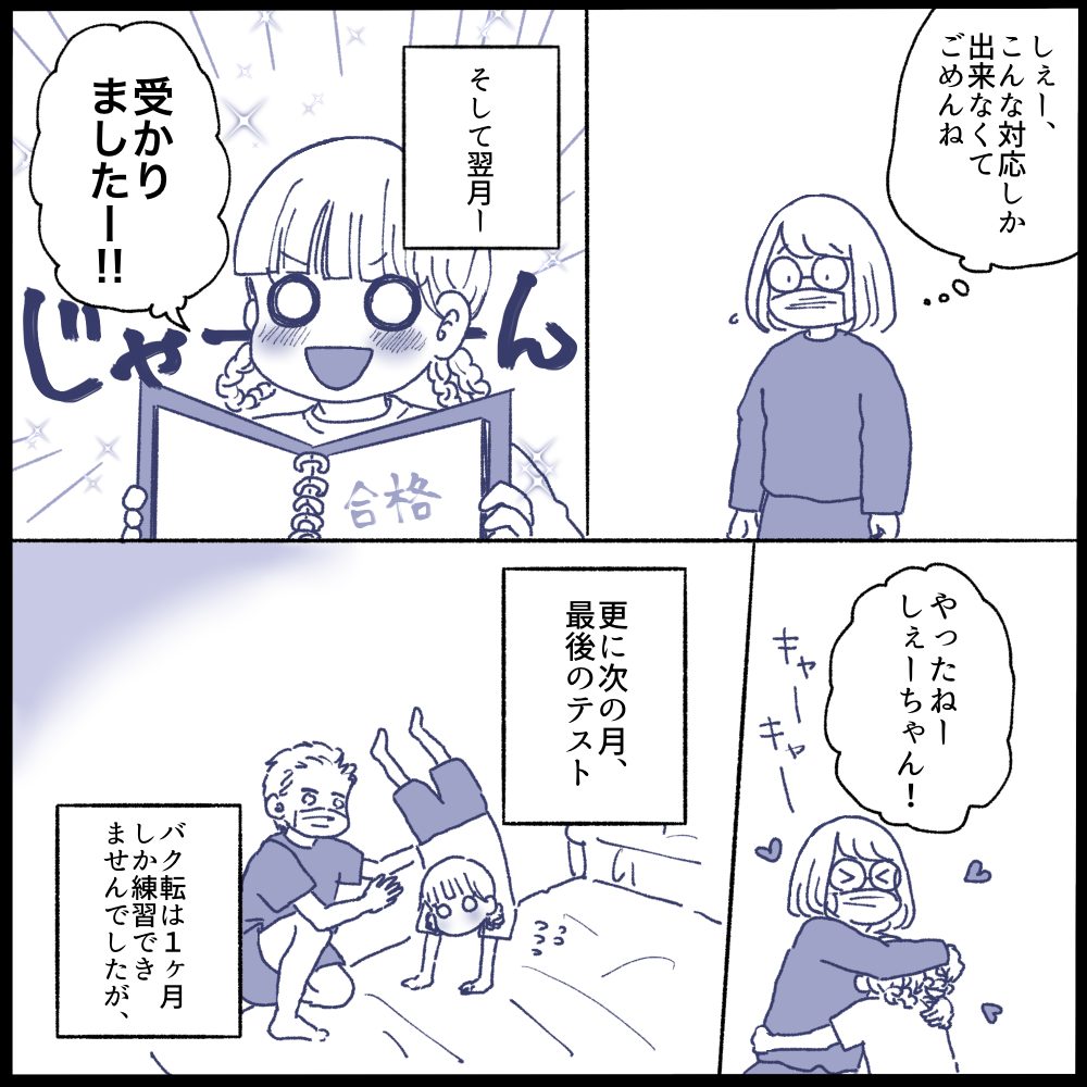 引っ越すと決まってから、娘はずっと目標にしてた「バク転」の級に上がって少しでも習ってから辞めたいと思ってたみたいで…不合格になって、残りの期間も短くて…今まで保護者席に来ることなんてなかったのに本当に悔しかったんだなと思います😢