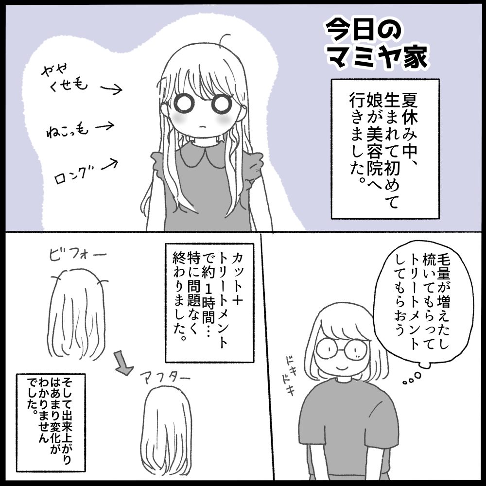 まったく梳いていない毛量と髪のパサつきが気になり、夏休みにはじめて美容院に行ったしぇーちゃん。