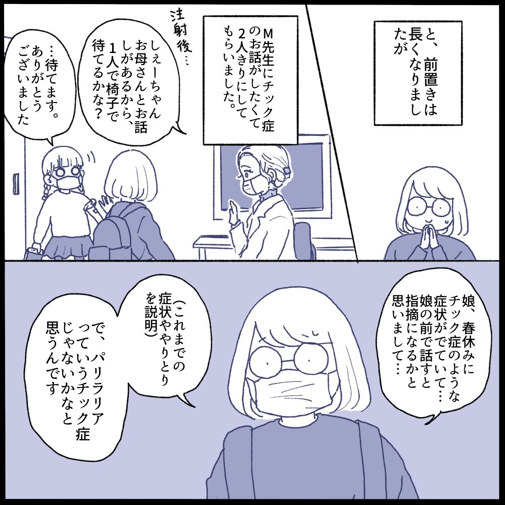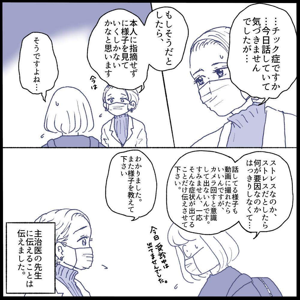 チック症は様子も見せられてないので、話しながら「一応親はそう思ってます…記録だけしといて下さい」って感じになってしまいました💦娘本人に自覚がないのでストレスの理由を聞き出すのも動画撮るのも難しくて😭💦