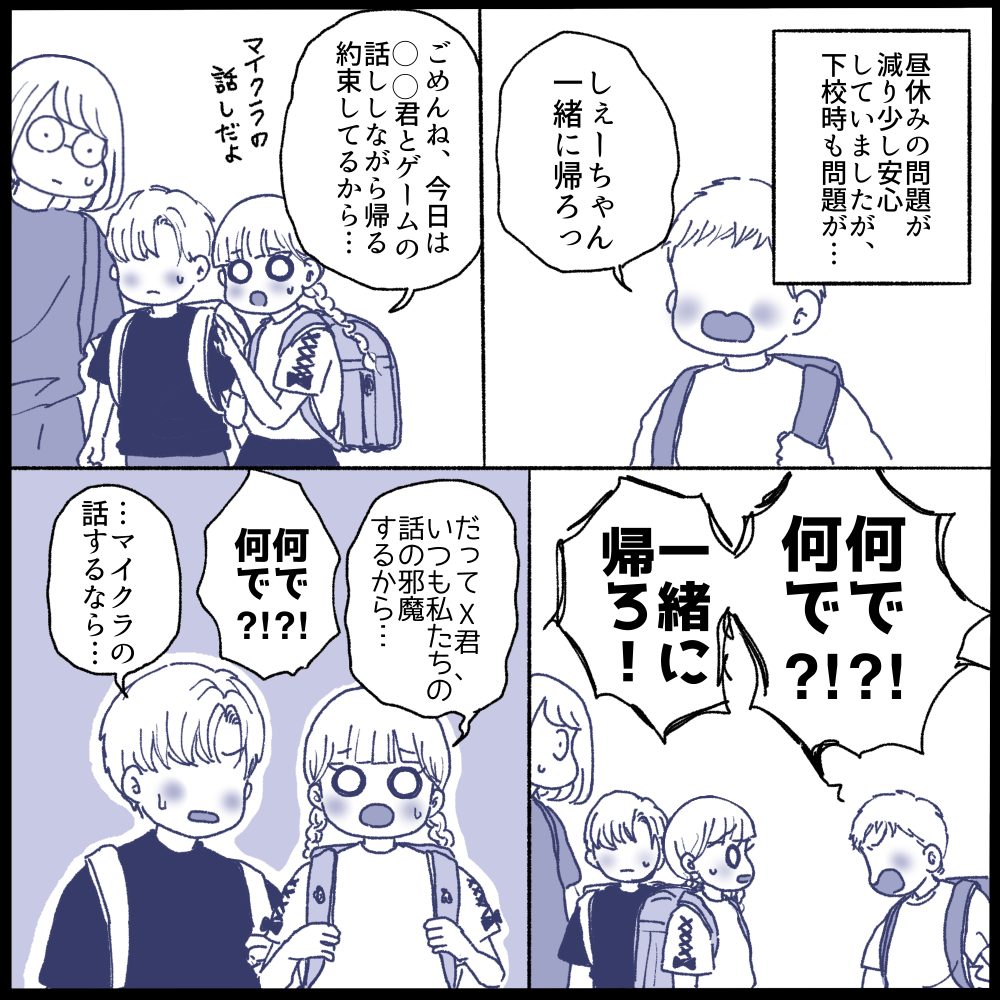 距離をおきたいのにX君は毎日昼休みや下校時に娘を誘ってきます。娘は一緒にいたくない気持ちがあり…でもX君はなかなかこちらの意図が伝わらず質問責めに😱