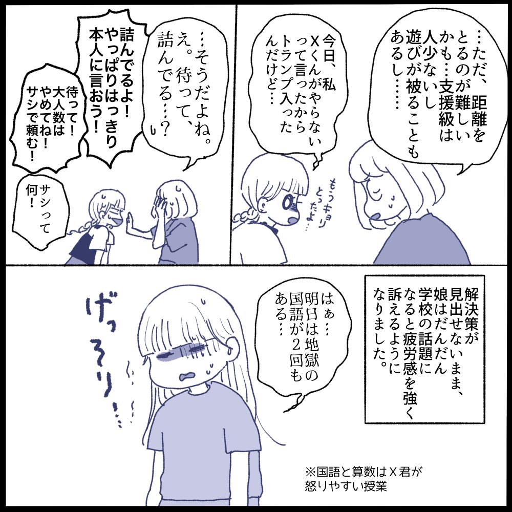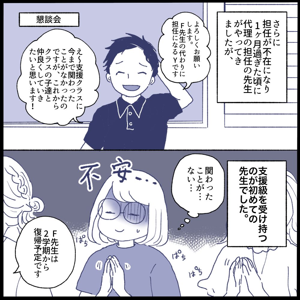 ここで学校側に相談できたら良かったのですが、担任不在でゴタゴタしてるクラスを先生方がなんとか過ごせるようにと尽力してくれているのを知っていたので…先生方にこれ以上の負担をかけていいのか悩み(昼休みは交流級に行かせてもらえる配慮もしてもらったし)、担任のF先生が復帰するか代わりの先生がいらっしゃるまで待つべきではとか考えてしまい相談せずにいました💦