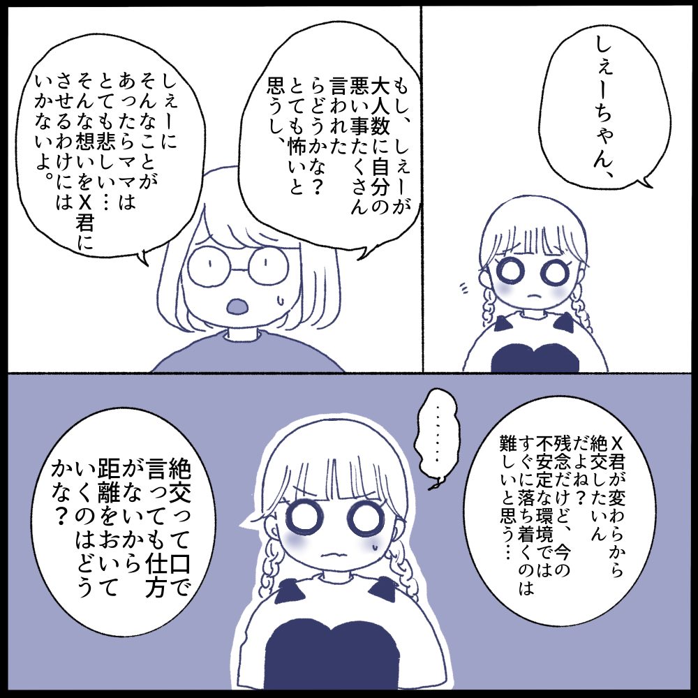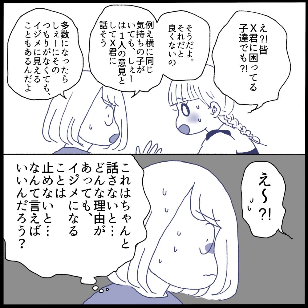 娘は多数で責めたら君に効果絶大だと思ったようです。でも…それって私的にはイジメの構図かなと…1対1なら喧嘩だけど、多数対1はイジメになるから絶対しないように伝えました。