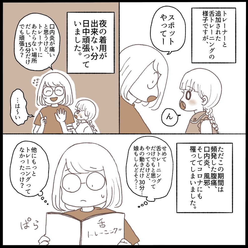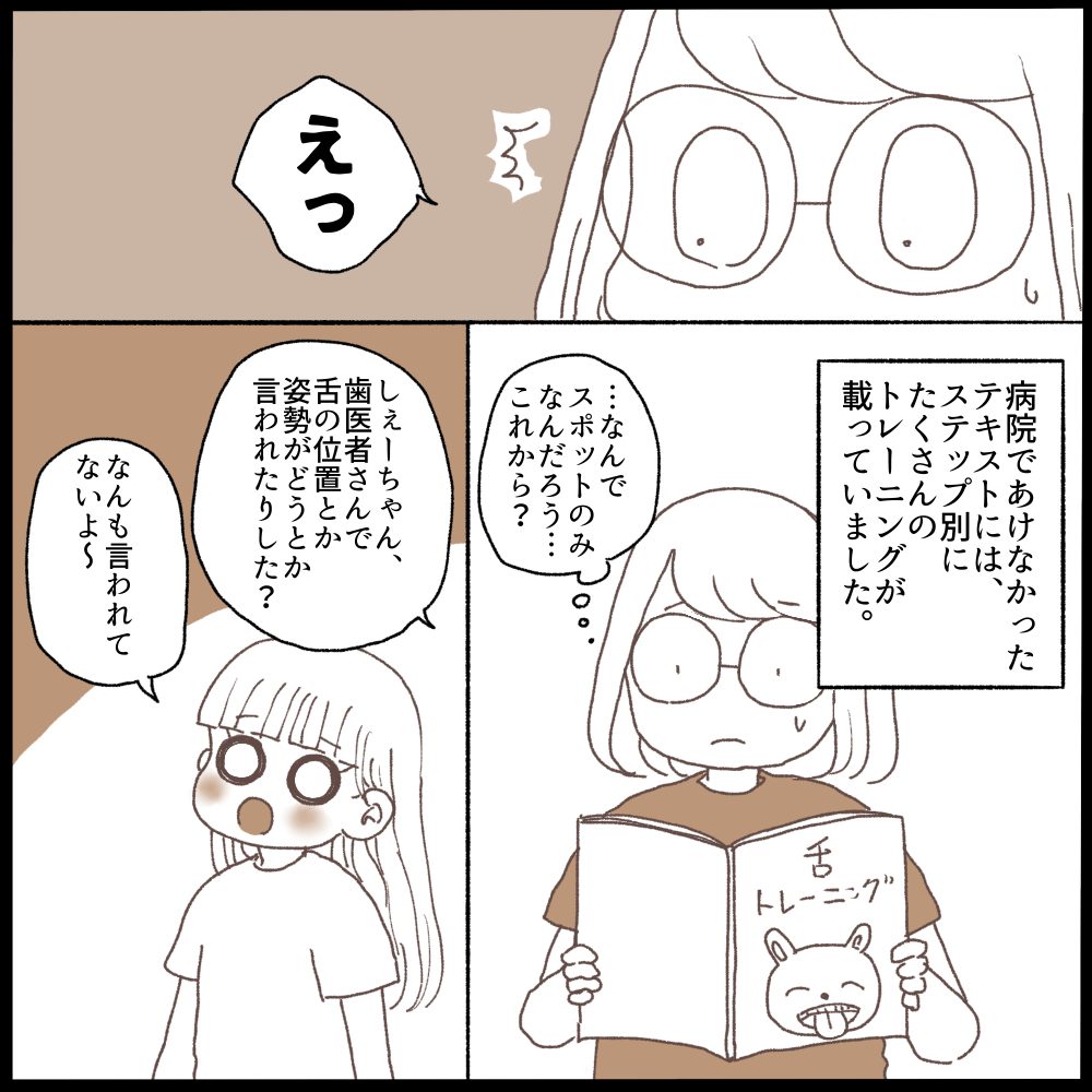 テキストの舌トレーニングは何個もあってこれをやったらすぐ20分くらい済みそうで…いやうちなんでスポットだけなの?その説明してくれないものなの?と…