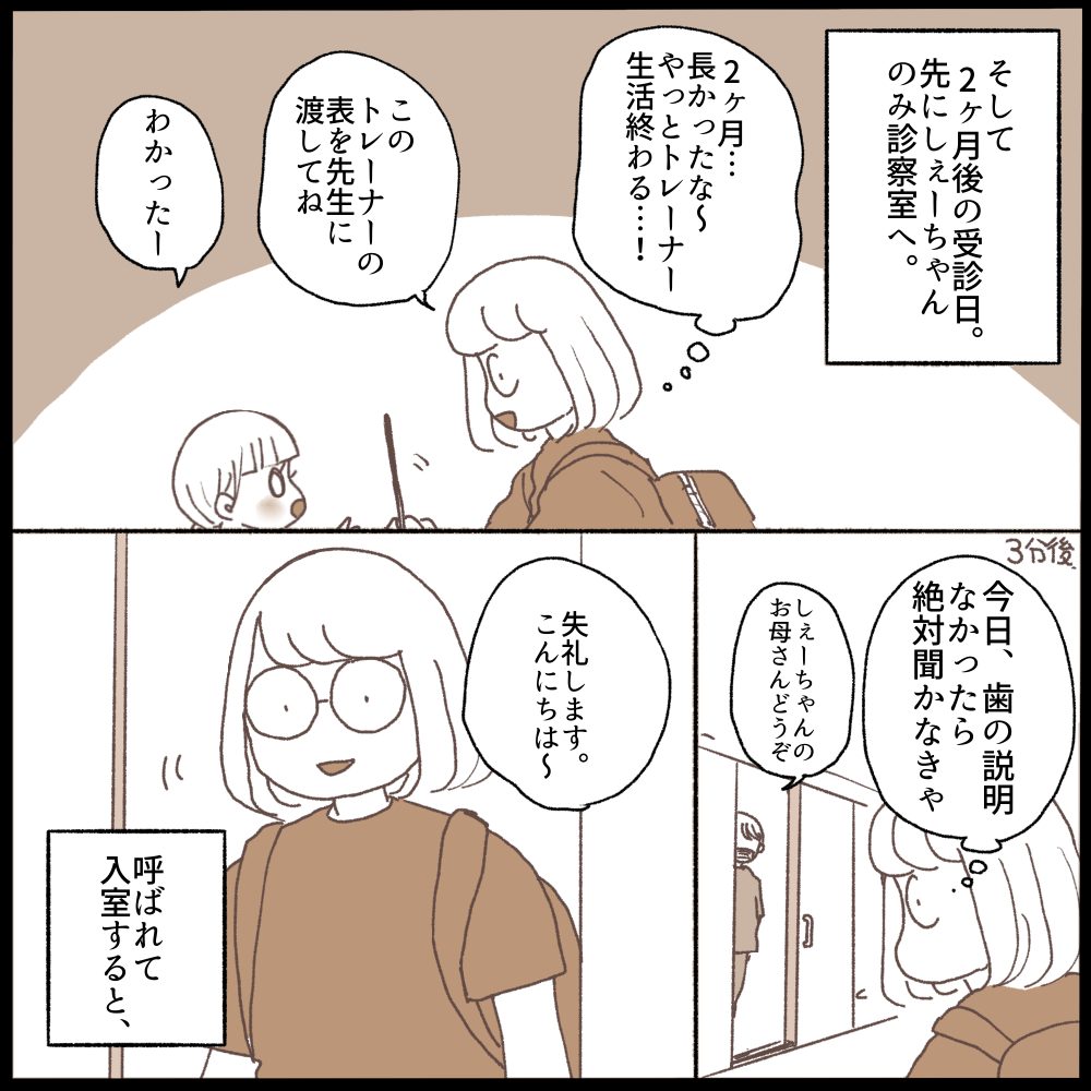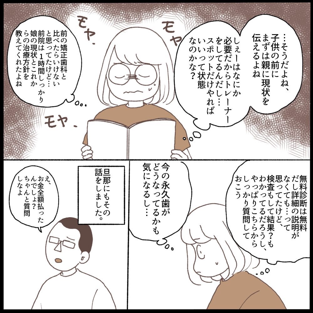 前の矯正歯科の先生は漫画でも描いてありますが娘の歯がどうなっていて、今後どうなるか、そうなった時どうするかなど矯正終了までの方針をしっかり教えてくださっていたので、それと比べてしまい余計に「なんも教えてくれないな…💧」とモヤモヤしてしまっていました。(少しは質問もしましたが、なんというか聞いたことのみ少し答えてくれる感じで…伝わるかな〜😭)