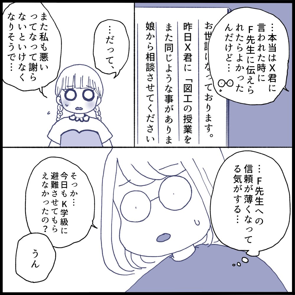 X君との言葉のトラブルは本当なら言われた時に先生にすぐ伝えた方がいいと思いましたが、娘はその頃先生への不信感があり「言ってもお互い様。私も謝らないといけなくなりそう」となっていました💦