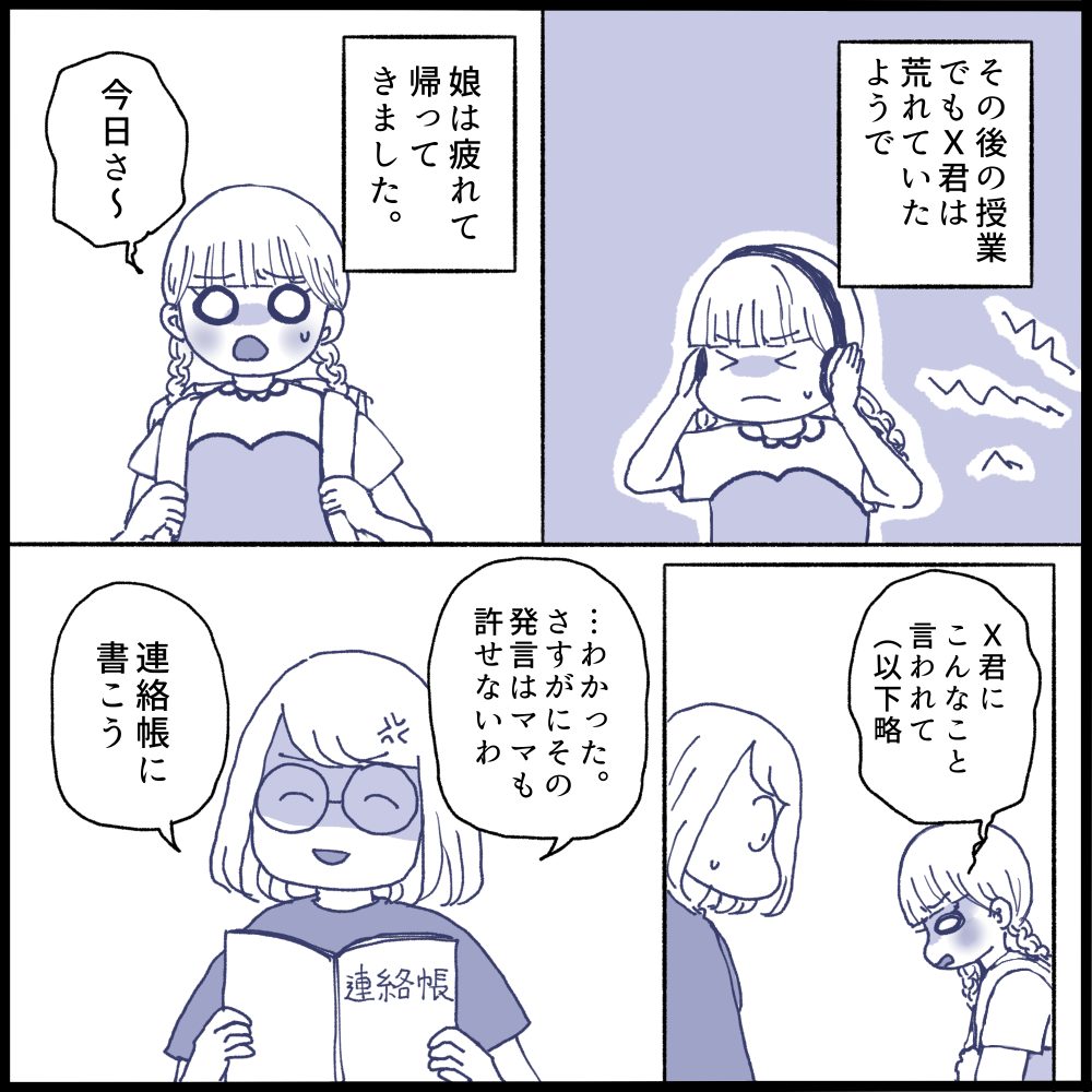 私はまたX君が似たようなことを言った場合は娘が相談するので対処して欲しいと連絡帳に書きました。