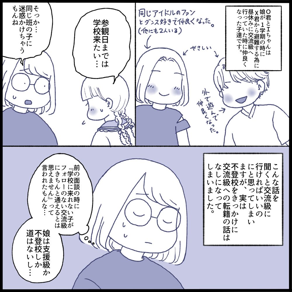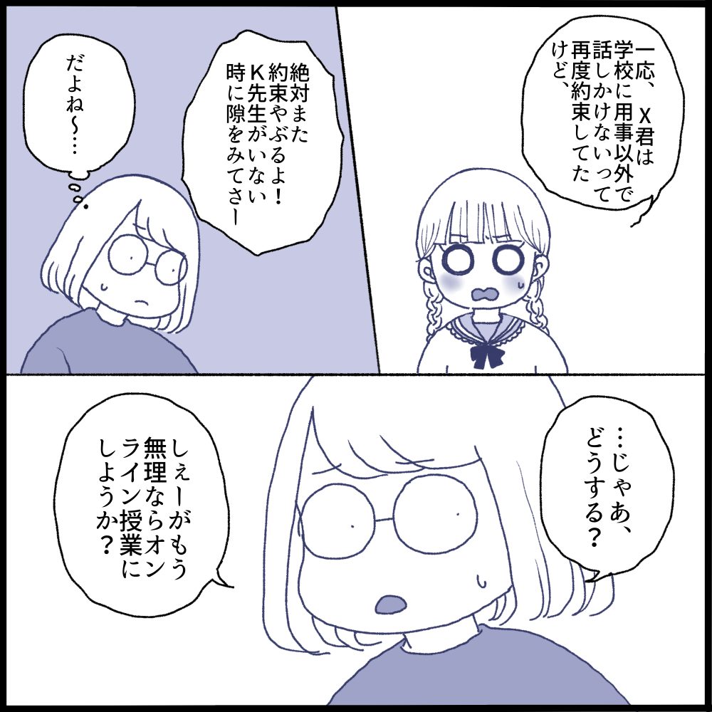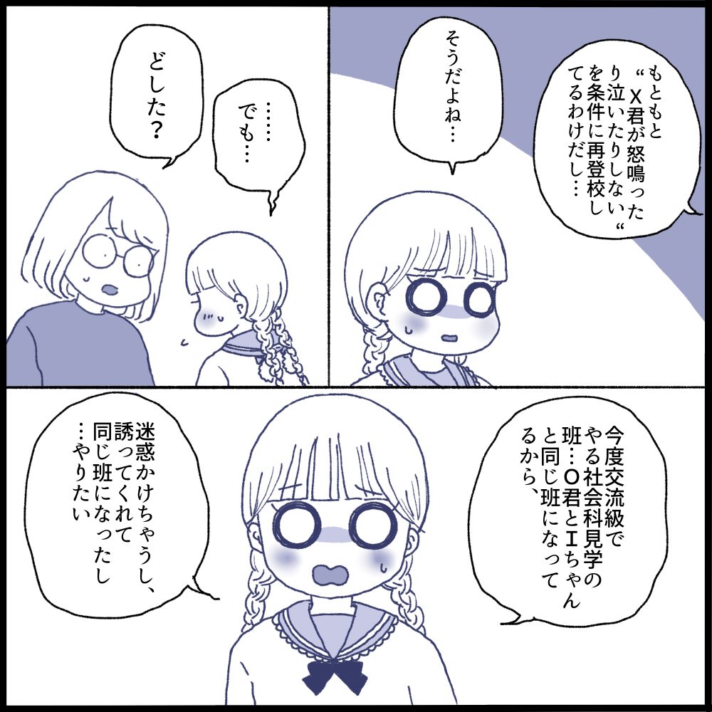 私はX君が娘に近づかないことはなくならないと感じ、オンライン授業でもいいと娘に伝えました。けど娘は交流級で出来た友達と社会科見学で同じ班になっており楽しみにしていました。