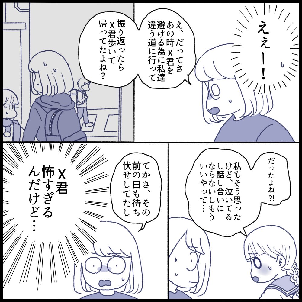 帰りの待ち伏せの件では、X君は嘘をついていると感じました。私達と別れた後普通に歩いて帰ってたし💦(ここには書けないのですがもう一点嘘だと思うエピソードがあります)