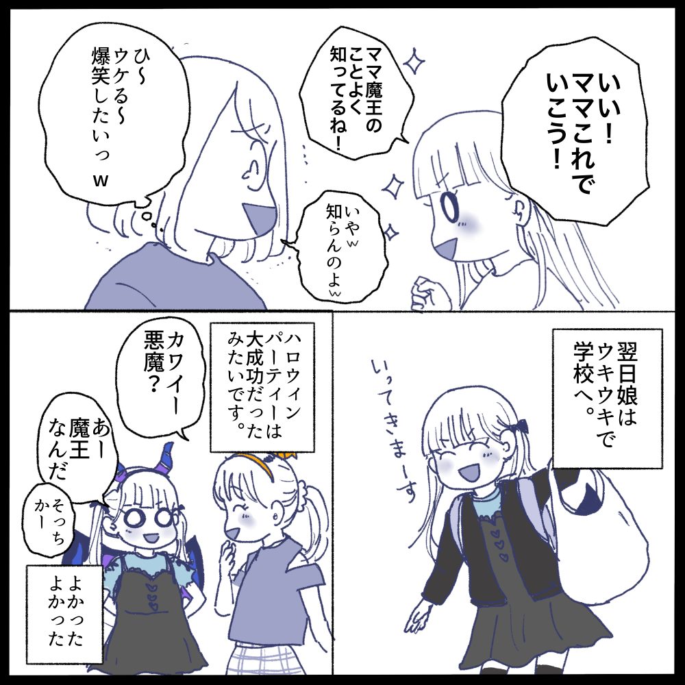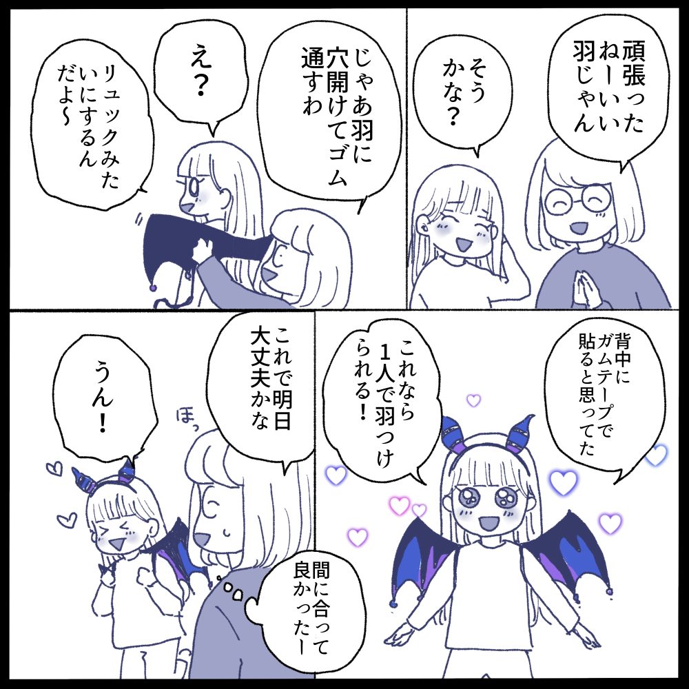 最後まで描くのに時間がかかってしまいました💦娘のハロウィンパーティーは無事終わりました☺️皆けっこう仮装してたみたいでとても楽しかったとのことでした❤️(皆から悪魔って言われたらしい。そりゃそうだ😂)