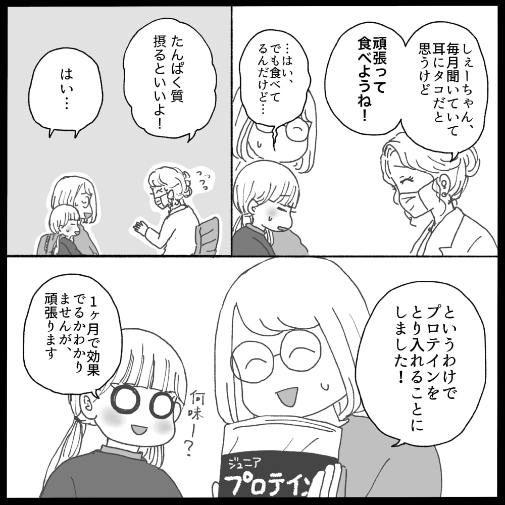 3ヶ月身長も体重も変化がないのでとにかく栄養をしっかりとる!ということでしたが、娘が食品から摂れるたんぱく質を増やす作戦を半年してこの結果なので😢プロテインを取り入れることにしました。