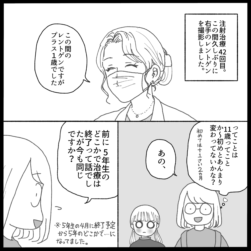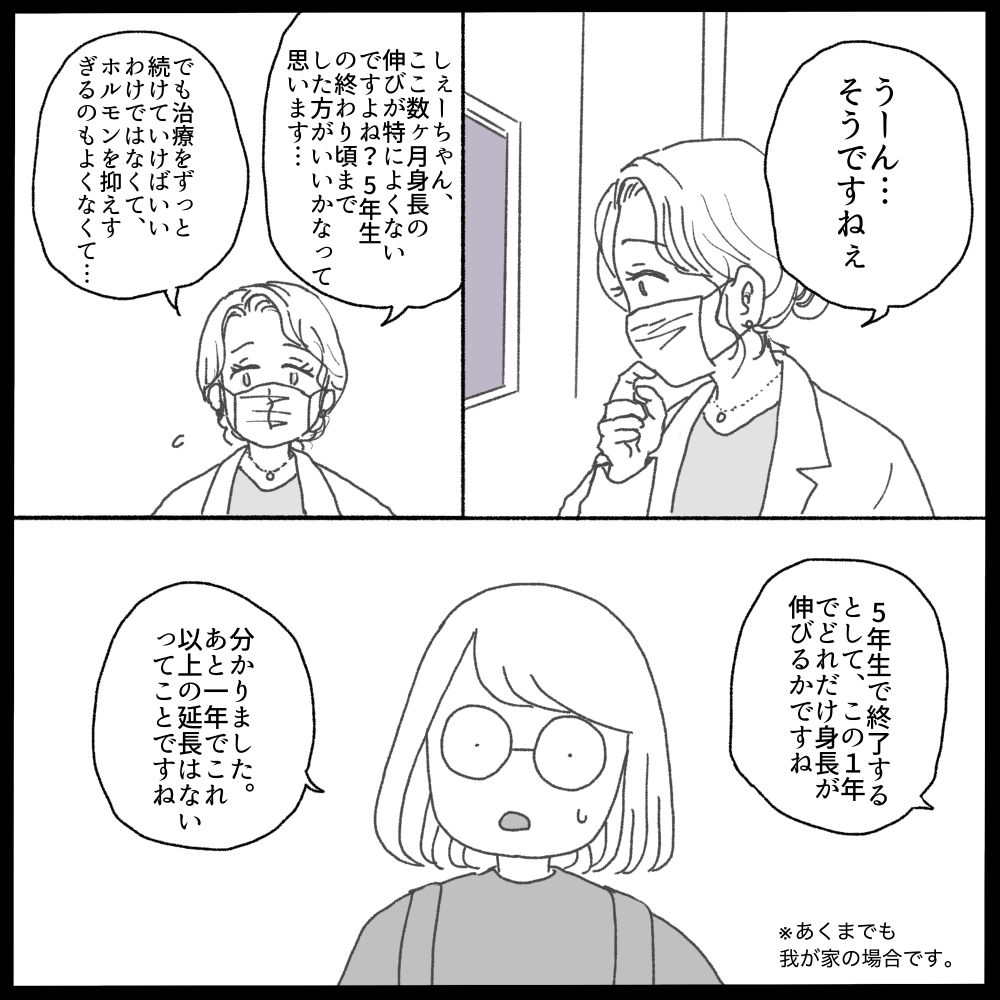 以前から何度となく体重の増えが悪く「たくさん食べるように」と言われてきた娘ですが、身長も伸びなくなってきていまして😭💦治療が5年生の4月で終わる予定をたてていたのが、5年生のどこか(夏くらいだったかな)になり、今回5年生の3月までとなりました。先生が言うにはこれ以上続けると逆によくないそうです。