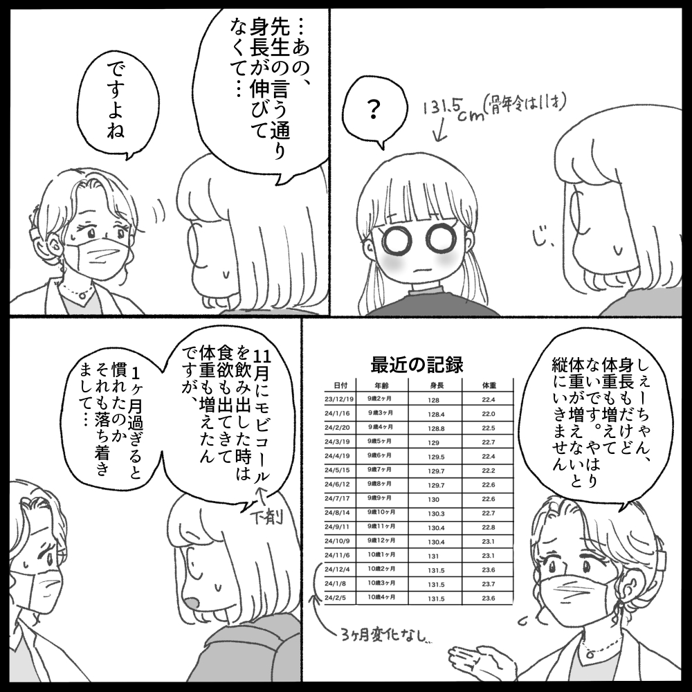 漫画に載ってる表を見ていただくとわかるのですが、年平均5センチ伸びる予定が3センチほどしか伸びてません😭先生が言うには体重を増やさないと縦に伸びるものも伸びないと…(体重変化なくても伸びてる子もいるのにな…って思いましたが😂)