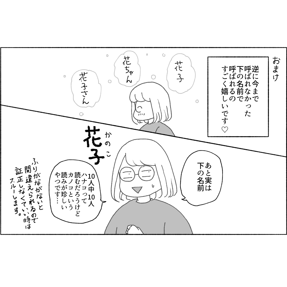 おまけの話の下の名前ですが(もちろん花子じゃないです)、今時の読みが分からないとかじゃなくてこの漢字ならこう読むのが普通だよね✨みたいな名前なので皆先入観があるから自信満々に読むんだけど実は違うっていう💦 しかも地味な名前なので苗字のインパクトで薄れ、名前は家族しか呼んでくれないなんて状態でした😂