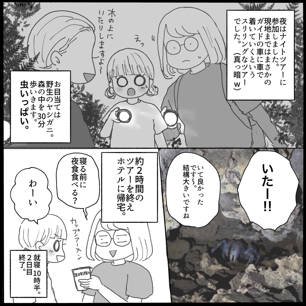 夜ナイトツアーは山真っ暗な道を自分で運転しなくてはいけないのでスリリングでした…アシダカグモとかカマドウマとか石垣島にいるゴキブリとオオヤスデとか色んな虫見れます。ヤシガニは大きいみたいなのですが、あまり近くではいなくて…でも綺麗な青いボディ✨✨生で見れて最高でした😆