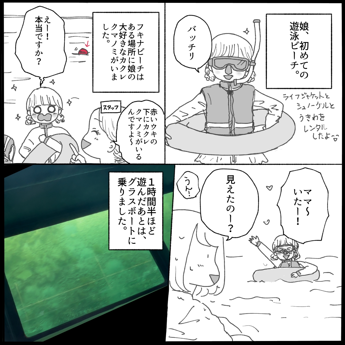 去年と昨日のイルカでシュノーケル慣れたみたいで、娘は海底を見たり😍