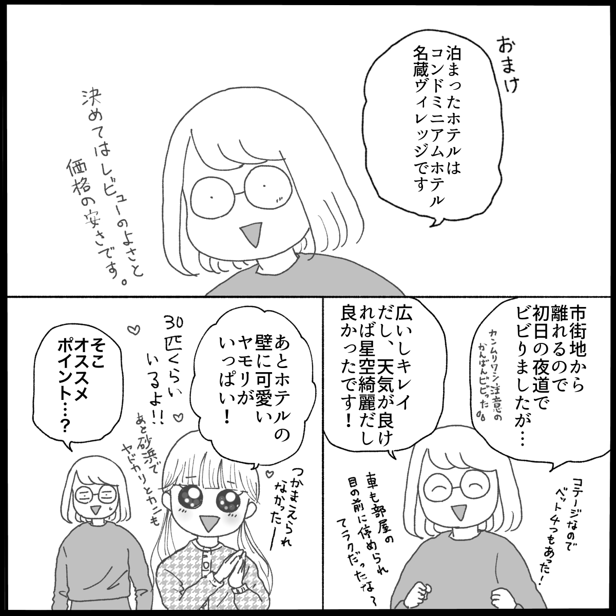 泊まったホテルはコテージだったので広くて過ごしやすかったです💕近くに浜遊び出来る海があって、ヤドカリやカニがいるので朝方行ったり、夜行ったり、夕方行ったり…時間があればそこで娘は生き物観察してました☺️夜は星空とたくさんのヤモリw(画像載せられないにが残念)初日に娘がヤモリに夢中で笑えましたwちっちゃい網持ってたけど素早くて全然捕まえられなかった…昔素手で捕まえた記憶あったんだけどな?